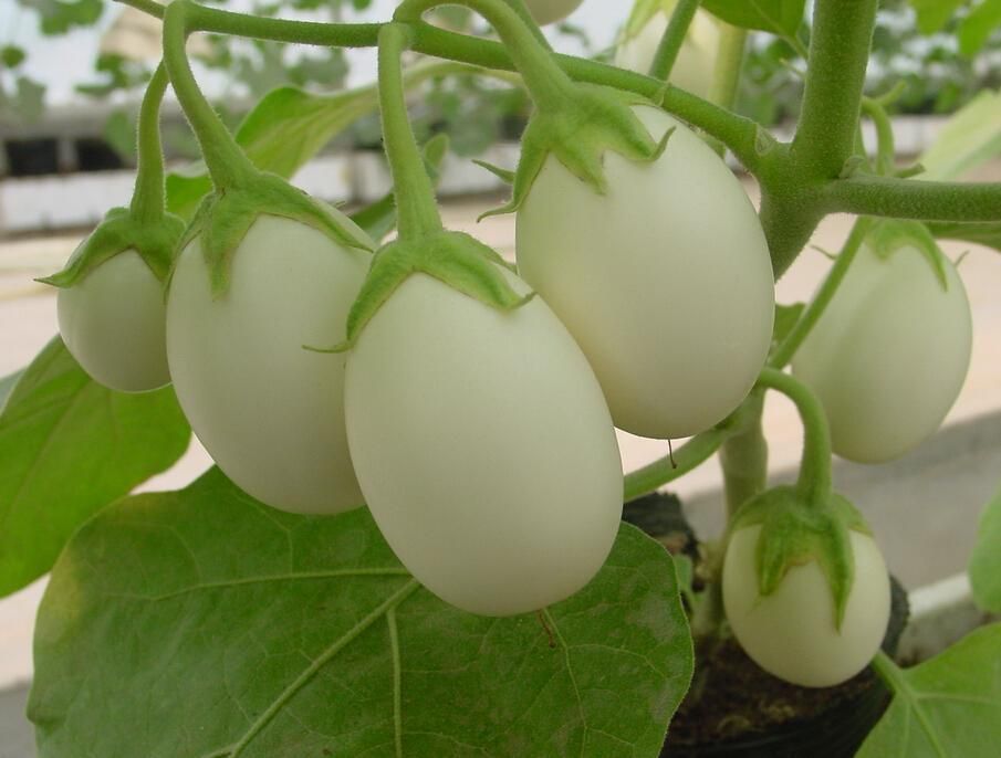 - 화이트 에그(White Egg)는 일본에서 수입된 조기(65일) 품종입니다. 계란 모양의 열매가 특징이며, 부드럽고 밝은 색의 과육은 버섯과 같은 맛과 향을 지닙니다. 결실 기간이 길고 씨방이 많아 수확량이 많아 인기가 좋습니다. 가지 덤불은 키가 약 70cm에 달할 정도로 촘촘합니다. 열매 무게는 최대 200g이며 크기는 10 x 8cm입니다. 급격한 기후와 온도 변화에도 잘 견디고 운반이 용이하며, 담배모자이크병과 같은 바이러스성 질병에 강합니다. 온실과 노지에서 재배하는 경우가 많습니다.