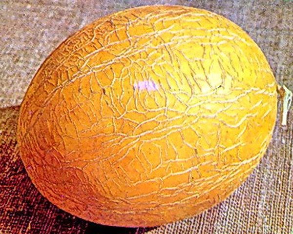 - 껍질은 매끈한 노란색 표면을 가지고 있습니다. 윗면은 중간 밀도의 망사로 덮여 있습니다. 껍질에는 무늬가 없습니다.