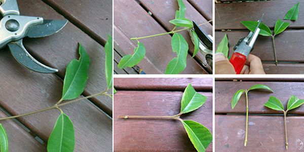 새싹은 수분이 가장 많은 이른 아침에 자르는 것이 좋습니다. 잘 소독된 날카롭고 잘린 가지치기 칼을 사용하여 자릅니다. 아랫부분은 새싹을 향해 45° 각도로 자릅니다. 윗부분은 새싹과 수평이 되도록 자릅니다. 가지는 마디 두 개(짧으면 세 개)와 잎 세 개가 있어야 합니다. 아랫부분은 완전히 제거하고, 윗부분 두 개는 수분 손실을 줄이기 위해 반으로 자릅니다.