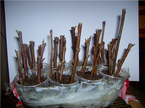 꺾꽂이로 번식하는 또 다른 방법은 녹색 새싹을 밑동에서 잘라 물을 채운 샴페인 병에 꽂은 후 (잎이 물에 빠지지 않도록 주의하세요!) 목 부분을 왁스나 정원용 피치로 밀봉하는 것입니다. 병을 목의 가장자리가 지면 아래 20cm가 되도록 묻고, 새싹을 잘라내어 지면 위로 세 개의 눈만 남겨둡니다. 비닐 랩이나 플라스틱 병의 절반으로 덮습니다. 주기적으로 공기를 빼주고 묘목에 물을 줍니다 (시간이 지나면 병 주변의 열린 땅에서 뿌리를 내리기 시작합니다). 2~3년 후에는 원래 위치로 옮겨 심을 수 있습니다.