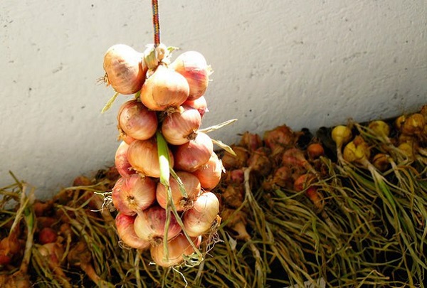깃털이 마르면 최대 10cm 길이의 "꼬리"를 남겨두고 제거해야 하며, 뿌리는 2cm 길이로 잘라야 합니다. 이렇게 가공된 열매는 용기나 그물에 보관하기 매우 편리합니다. 유통기한을 연장하려면 2025년에 수확한 열매를 주기적으로 "흔들어 주세요." 수확하고 말린 후, 2025년에 수확한 열매를 나일론 타이츠에 싸서 집이나 아파트의 어둡고 건조한 구석에 걸어 둘 수 있습니다. 또 다른 방법은 구근을 땋는 것입니다. 하지만 이 경우, 긴 "꼬리"(최대 15cm)를 남겨둡니다. 구근 몇 개를 서로 엮은 다음 끈에 감아 매달아 보관합니다.
