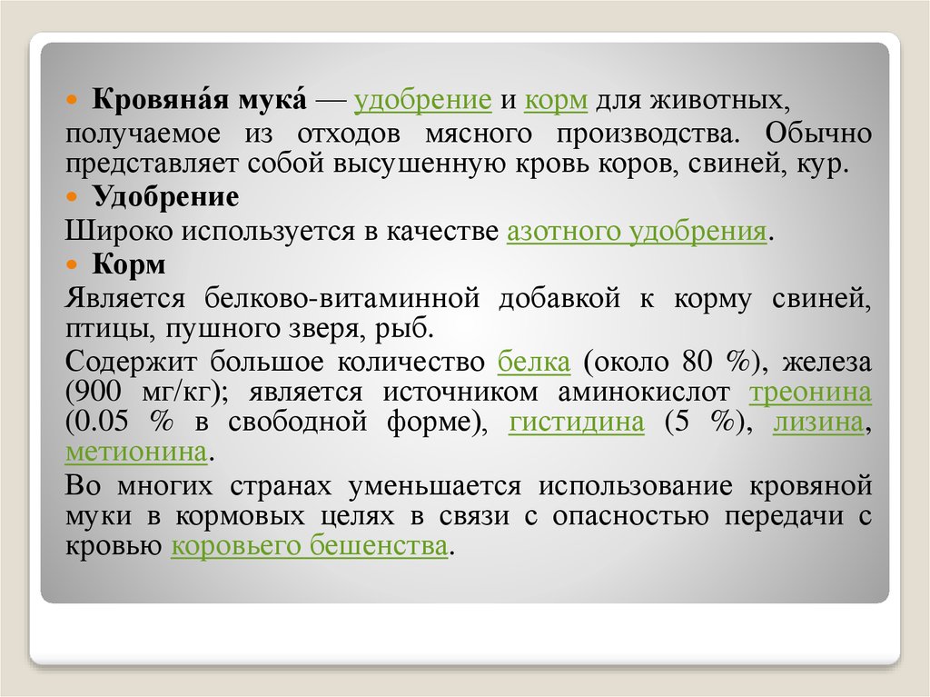 이 비료에는 회분, 피브린, 류신, 메티오닌, 시스틴, 라이신이 함유되어 있습니다. 그러나 인이나 칼륨은 함유되어 있지 않아 시용이 다소 어렵습니다. 사용 전에 혈분과 골분을 혼합하여 시용하는 것이 좋습니다. 이렇게 하면 사료에 부족한 미량 영양소가 보충됩니다.