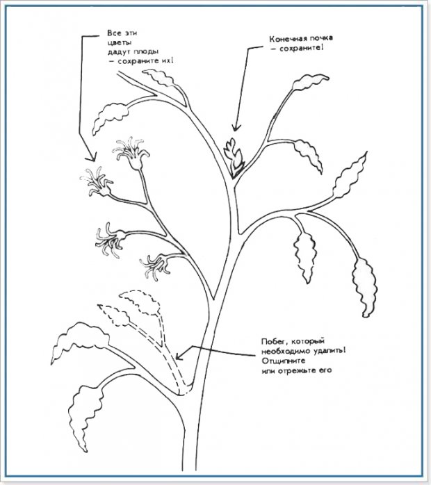 마지막 단계는 수풀에 11~13개의 잎이 형성되고 주줄기가 60cm 이상 자랄 때 진행됩니다. 녹색 덩어리가 더 이상 자라지 않도록 식물의 윗부분을 꼬집어 줍니다. 그 후에는 시즌이 끝날 때까지 풍성한 수확을 보장하기 위해 수풀을 적절히 관리해야 합니다.