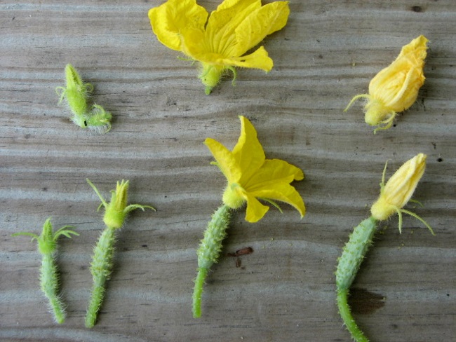 오이를 꼬집으려면 암꽃과 수꽃차례를 구별할 수 있어야 합니다. 어려운 일은 아닙니다. 불임화와 열매 맺는 꽃을 구분하는 몇 가지 특징만 알면 됩니다. 수꽃은 얇은 꽃자루에 피고, 암꽃은 크기는 작지만 눈에 띄는 씨방이 있습니다.