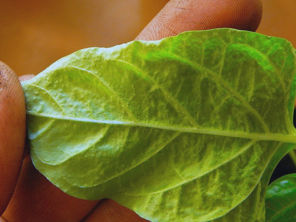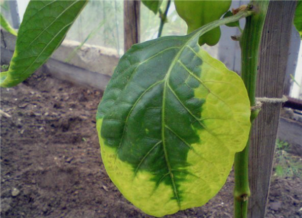 잎은 중앙부터 노랗게 변하고, 밑동에는 특징적인 잎맥이 나타납니다. 이 경우 토양의 철분 함량에 주의하십시오. 철분 결핍 증상을 없애려면 고추 윗부분에 황산제일철을 살포하십시오. 살포 후 용액이 남아 있으면 식물 아래 토양에 붓기만 하면 됩니다.