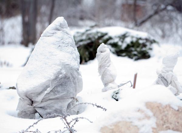 겨울철 식물을 준비할 때는 묘목이 자란 불활성 토탄을 제거하고 심기 구멍의 흙으로 흙을 채우는 것이 중요합니다. 가을에는 뿌리 목을 12cm 높이까지 흙더미로 덮어줍니다. 새로 심거나 옮겨 심은 식물은 새순을 모아 묶어 덮어줍니다. 시중에서 구할 수 있는 삼베나 스펀본드와 같은 재료를 사용합니다. 가지에 감싼 후, 안전을 위해 두꺼운 밧줄로 고정하되, 손상을 방지하기 위해 너무 세게 조이지 않습니다.