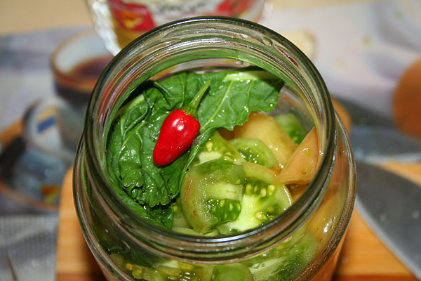 - 풋토마토 8kg을 살균된 병에 넣습니다. 허브(취향껏)와 얇게 썬 고추를 넣습니다.