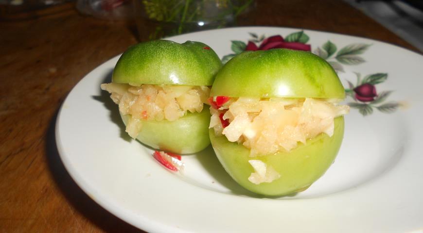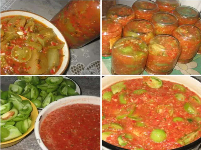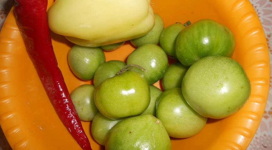 - 야채 퓌레에 소금 135g과 식물성 기름 60ml를 넣습니다. 소스를 1~2시간 동안 그대로 둡니다. 준비된 청토마토를 2~4조각으로 자릅니다. 냄비에 넣고 아지카 소스를 붓습니다.