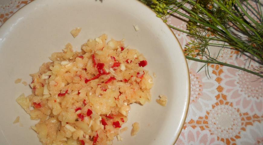 - 마늘 100g을 4분의 1로 자릅니다. 고추 몇 개를 작은 링 모양으로 자릅니다.