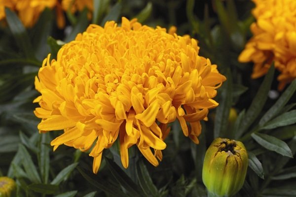 - 그놈(Gnome). 이 금잔화는 키가 0.2~0.3m까지 자라지만, 꽃차례는 꽤 큽니다(약 80mm). 색상은 균일하고, 매우 밝습니다.