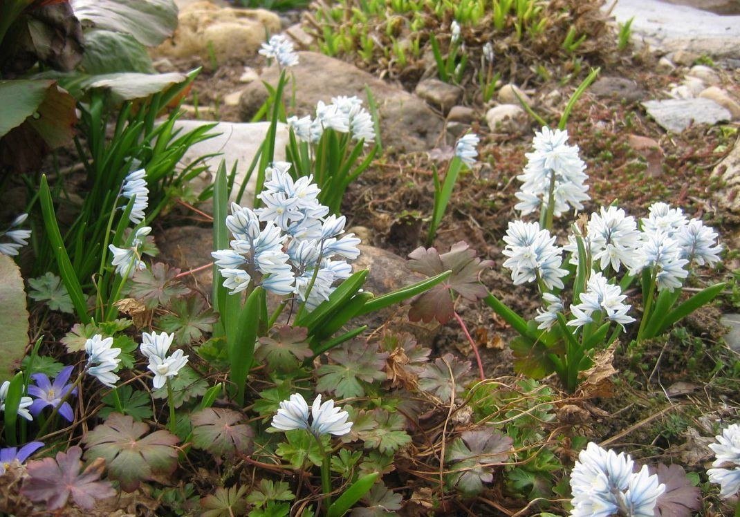 스노드롭처럼 이 앵초는 녹은 눈을 뚫고 가장 먼저 꽃을 피웁니다. 스킬라는 키가 13~15cm까지 자라며, 축 늘어진 눈처럼 하얀색 또는 청록색 꽃을 피웁니다.