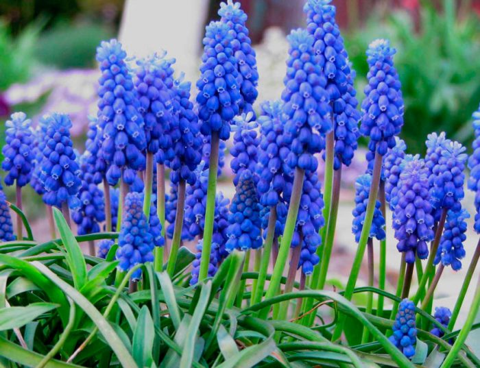 이 품종의 다른 이름으로는 '마우스 히아신스' 또는 '바이퍼스 오니언'이 있습니다. 최대 15cm까지 자라며, 작은 피라미드 모양의 꽃을 피웁니다. 파란색과 분홍색 등 다양한 색조의 꽃을 피웁니다. 눈처럼 하얀 무스카리도 발견됩니다.