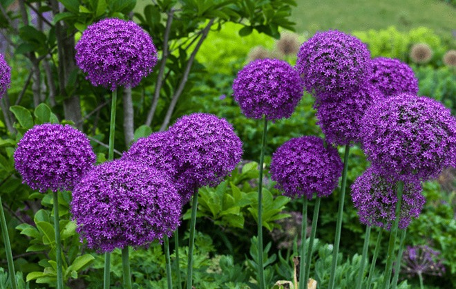 관상용 양파라고도 불리는 이 꽃은 키가 50cm 이상 자라며 5월 하순에 꽃이 핍니다. 길고 곧은 줄기 위에 돋아나는 꽃차례는 흰색, 라벤더색, 노란색, 또는 적갈색의 커다란 "공" 모양입니다.