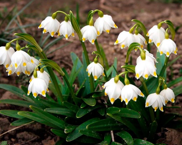 눈 덮인 곳에서 잘 자라는 또 다른 식물입니다. 늦겨울부터 이른 봄까지 꽃이 피기 시작합니다. 스노드롭은 키가 최대 0.1m까지 자랍니다. 아래로 늘어진 꽃차례는 눈처럼 하얀색이며, 때로는 연두색 줄무늬가 있고, 종 모양을 하고 있습니다.