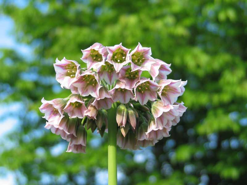 이 꽃은 관상용 마늘의 일종입니다. 키가 1미터가 넘습니다. 꽃은 늦봄과 초여름에 피는데, 꽃봉오리는 녹자색이며 흰색 줄무늬가 있습니다.