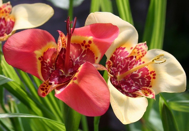 티그리디아 꽃차례는 난초와 비슷한 모양을 하고 있습니다. 이 품종은 다양한 색상과 독특한 모양이 특징입니다. 키는 30cm에서 70cm까지 자랍니다. 꽃은 여름 후반에 핀다.