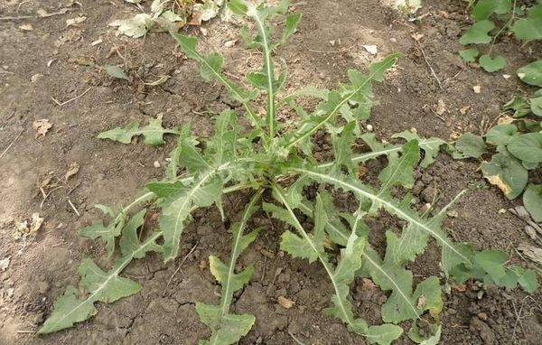- 잎은 장타원형(최대 25cm)이고 톱니가 있으며, 삼각형의 측엽이 있고 가장자리에 가시가 있으며, 아래쪽 잎은 잎자루가 있고 위쪽 잎은 잎자루가 없으며 줄기에 번갈아 배열됩니다.