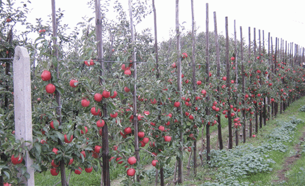 사과나무는 봄에 엇갈리게 심는 것이 가장 일반적입니다. 이 경우, 나무를 두 줄로 평행하게 심고, 그 사이에 뚜렷한 엇갈림을 둡니다. 이 식재 방식은 "지지대" 위에 심는 팔메트 과수원에 적합합니다.