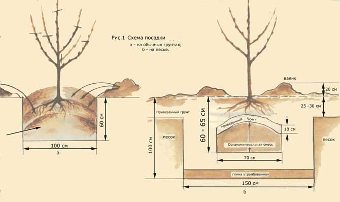 심는 구덩이는 예상 심기일 한 달 전에 준비합니다. 구덩이 바닥에는 붉은 벽돌과 팽창 점토를 깔고, 그 위에 토탄, 부식질, 목질 토양, 그리고 낙엽 퇴비를 같은 비율로 섞은 비옥한 흙을 덧씌웁니다.